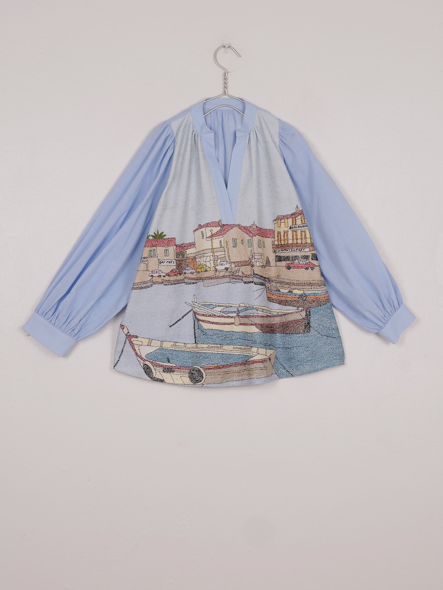 La blouse claudie à manches longues est tissée à la main en voile de coton léger. Elle dévoile le paysage du port de Martigues dans le Sud de la France, brodé selon la technique traditionnelle Kantha.