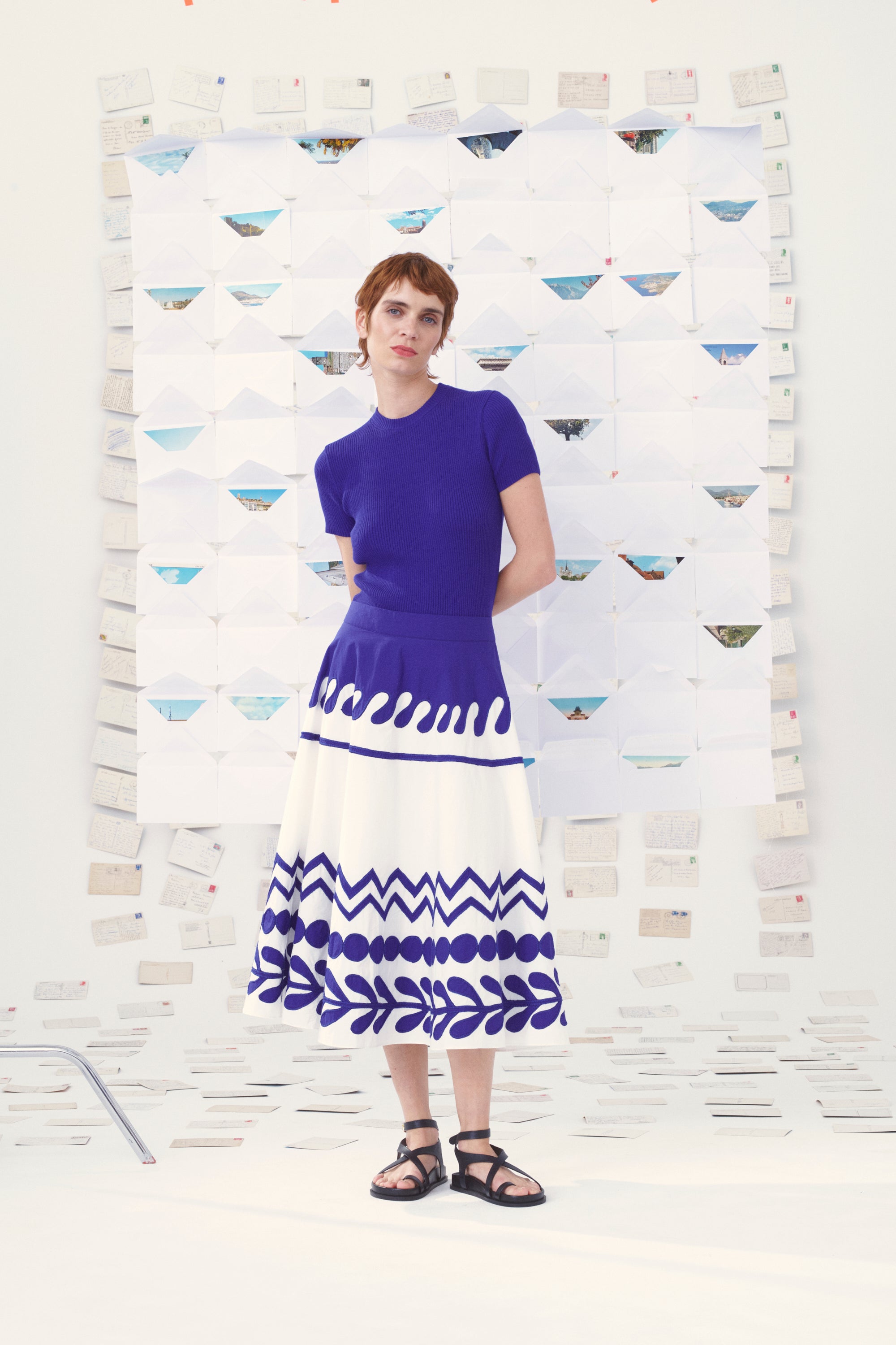 En popeline de coton, la jupe corfou s’inspire des céramiques Grecques. Sur un fond blanc lumineux, les motifs bleu royal sont réalisés en applique, puis délicatement brodés à la main pour souligner les contours.