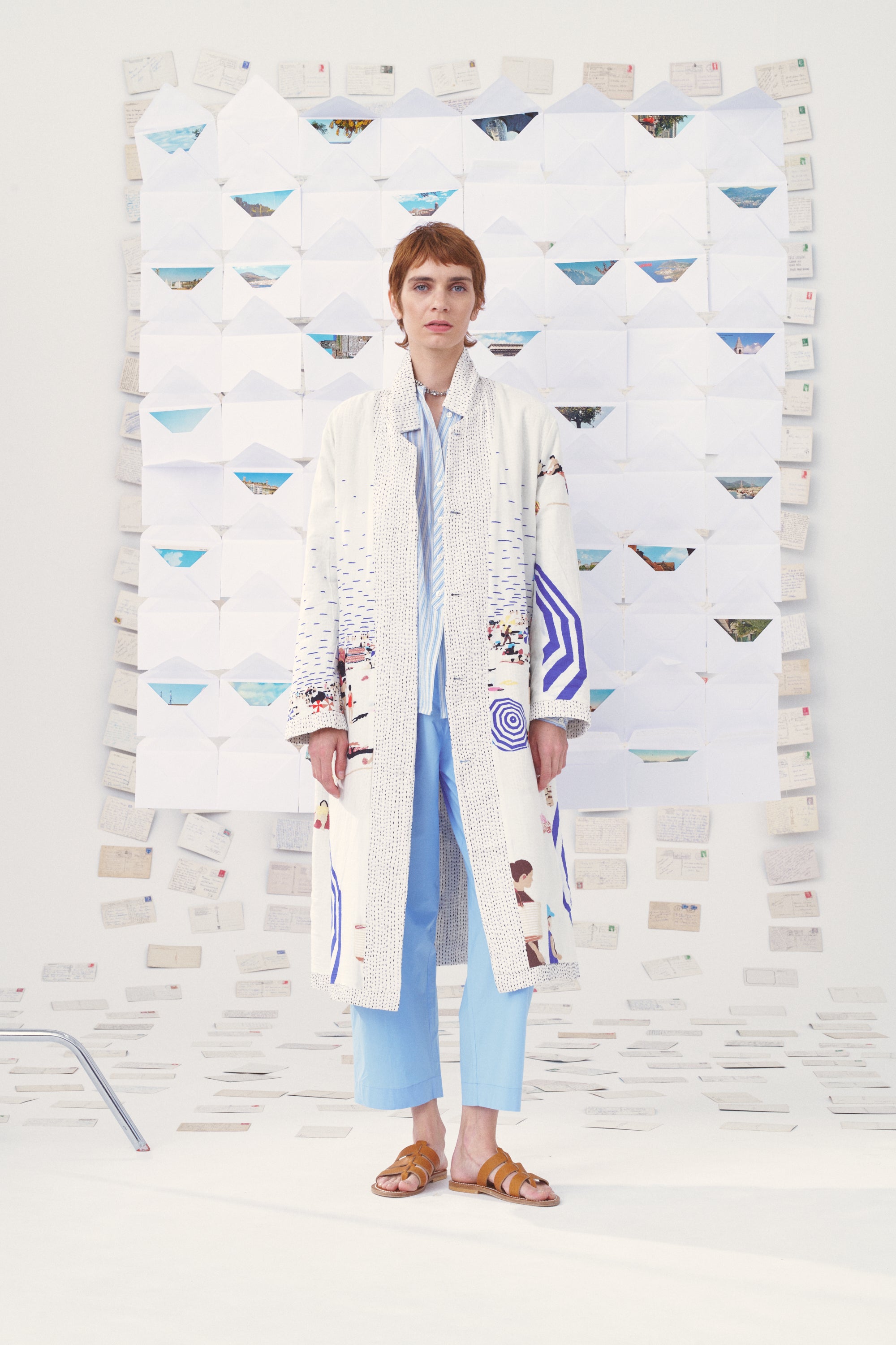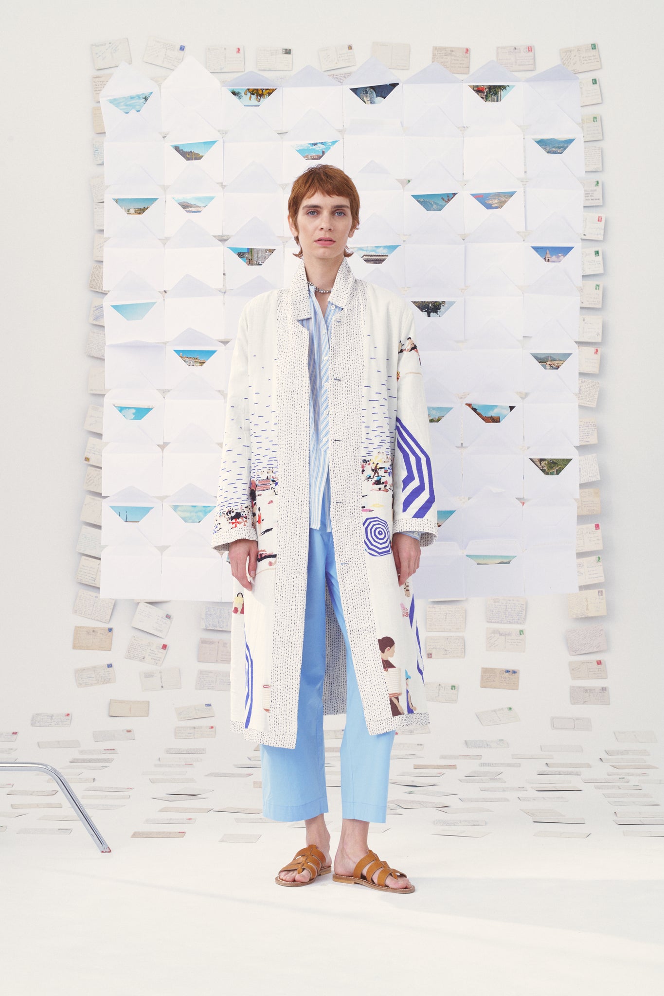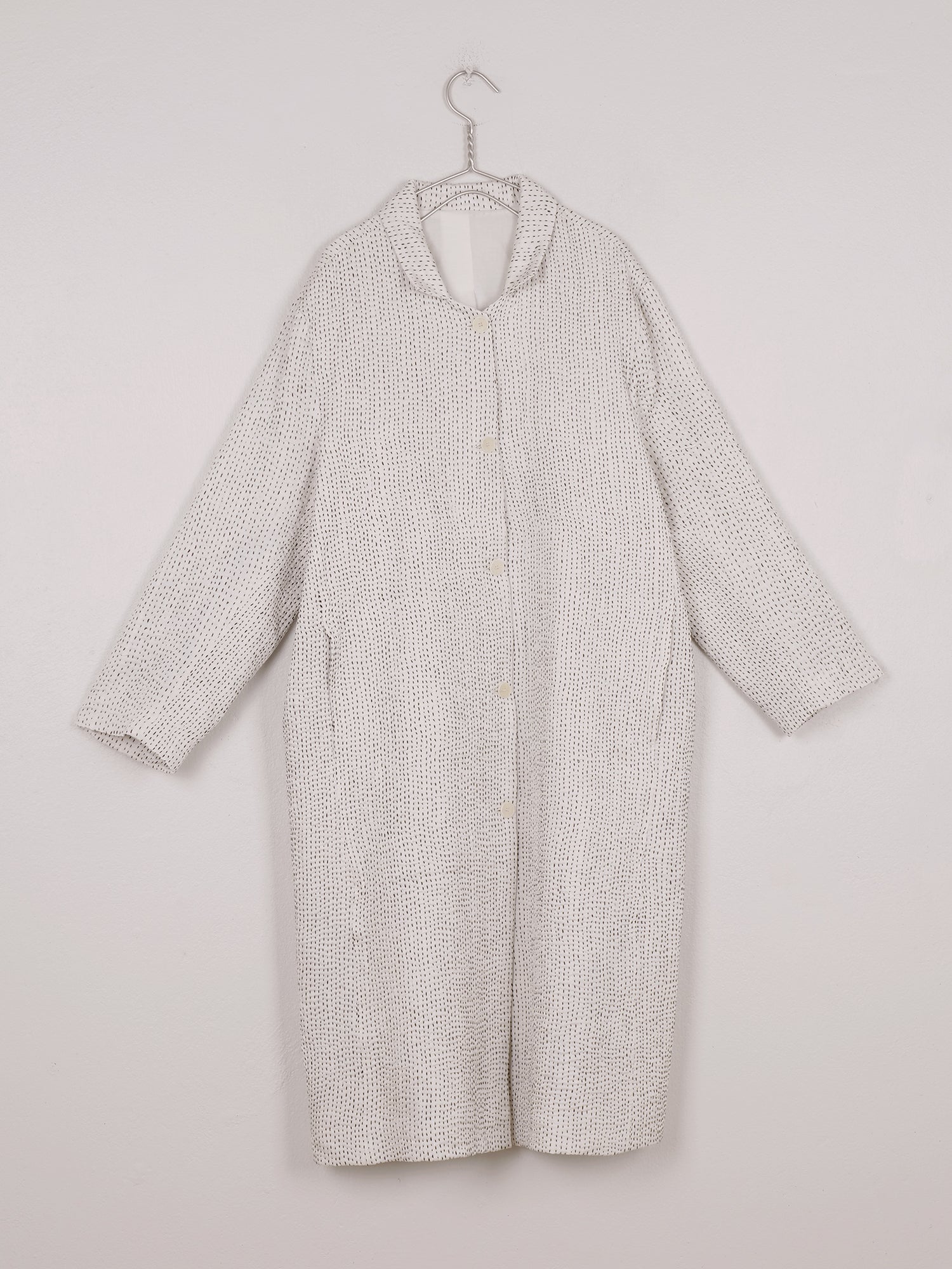 Confectionné en satin de soie, le manteau doniv se distingue par sa broderie Kantha extérieure et sa réversibilité. D’un côté, le relief délicat du fil ; de l’autre, une sérigraphie inspirée des cartes postales de vacances, évoquant les plages d’été.