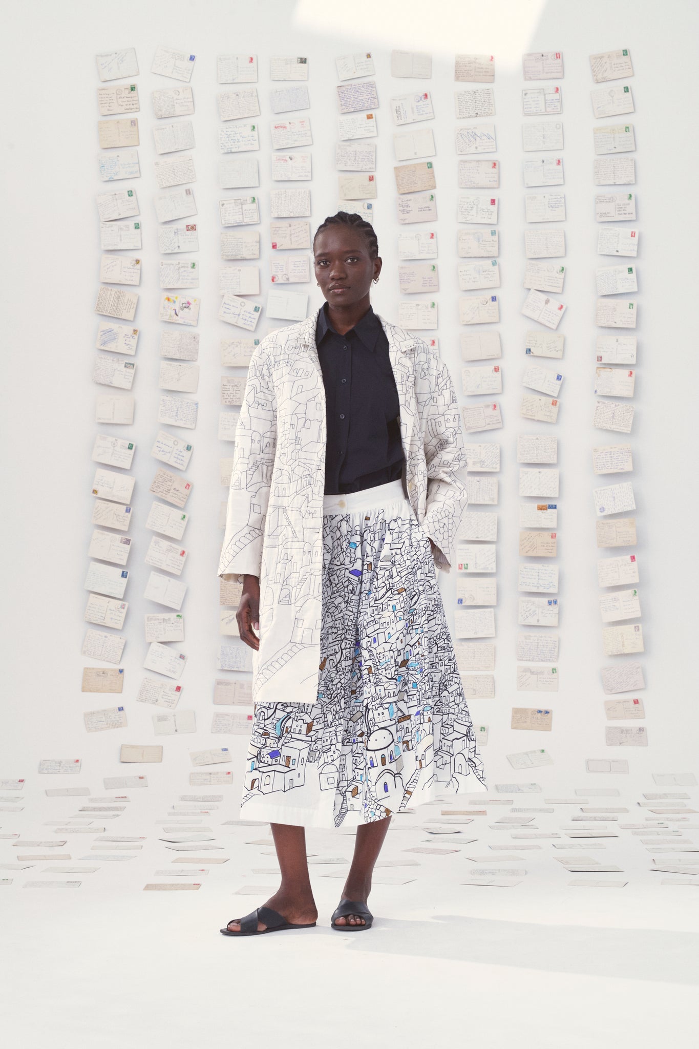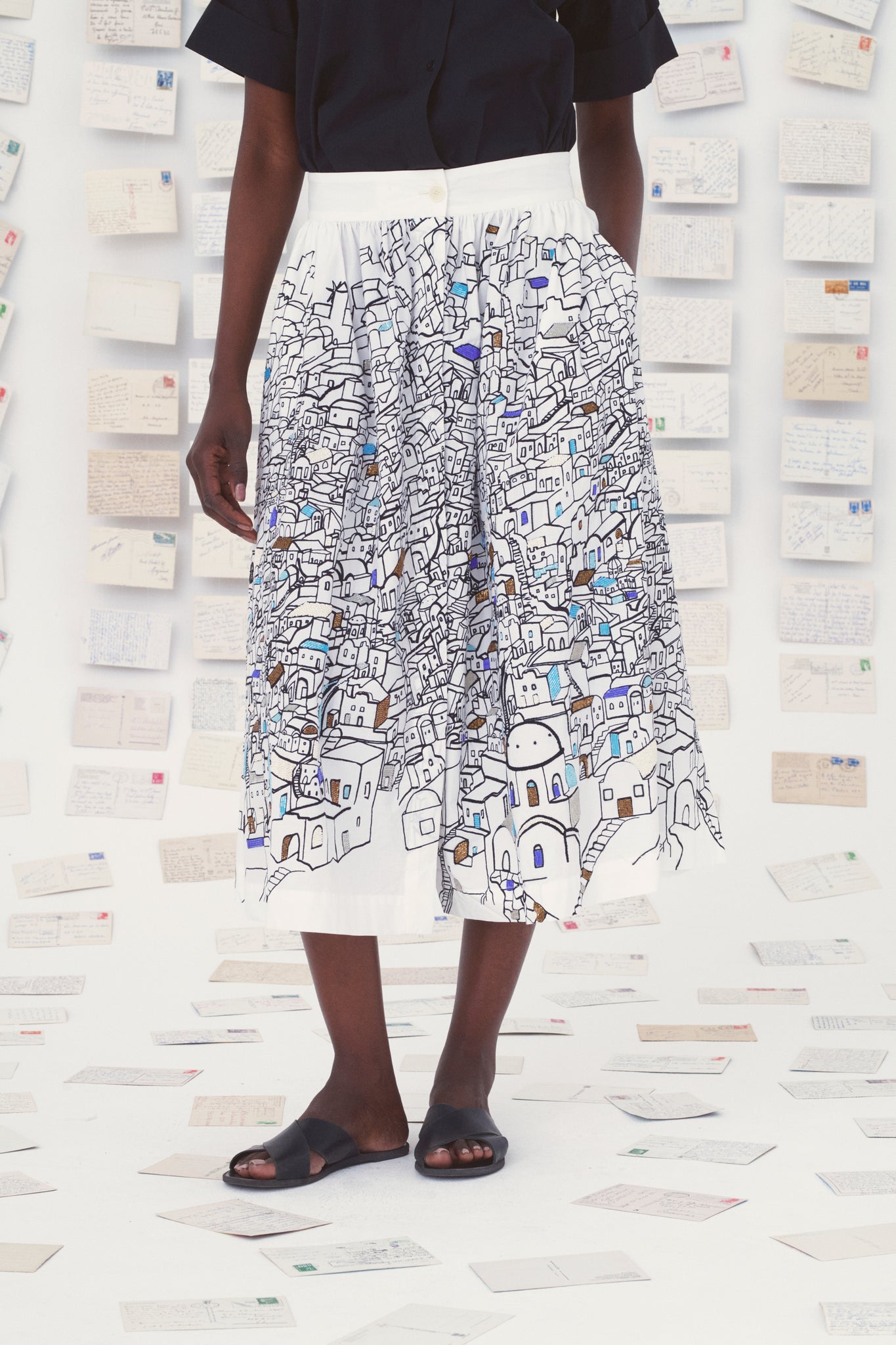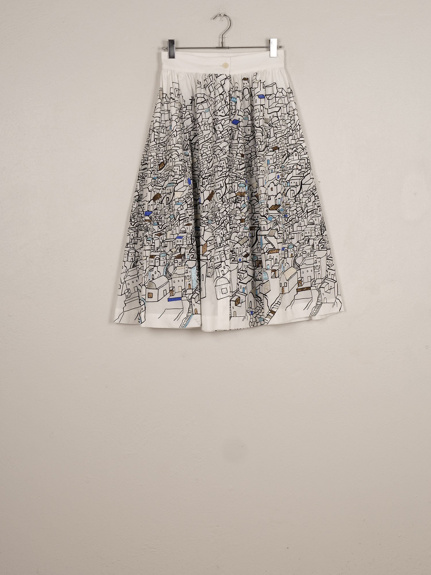 En popeline de coton, la jupe mona captive par son village grec sérigraphié et brodé à la main, relevé de perles de verre qui apportent relief et finesse.