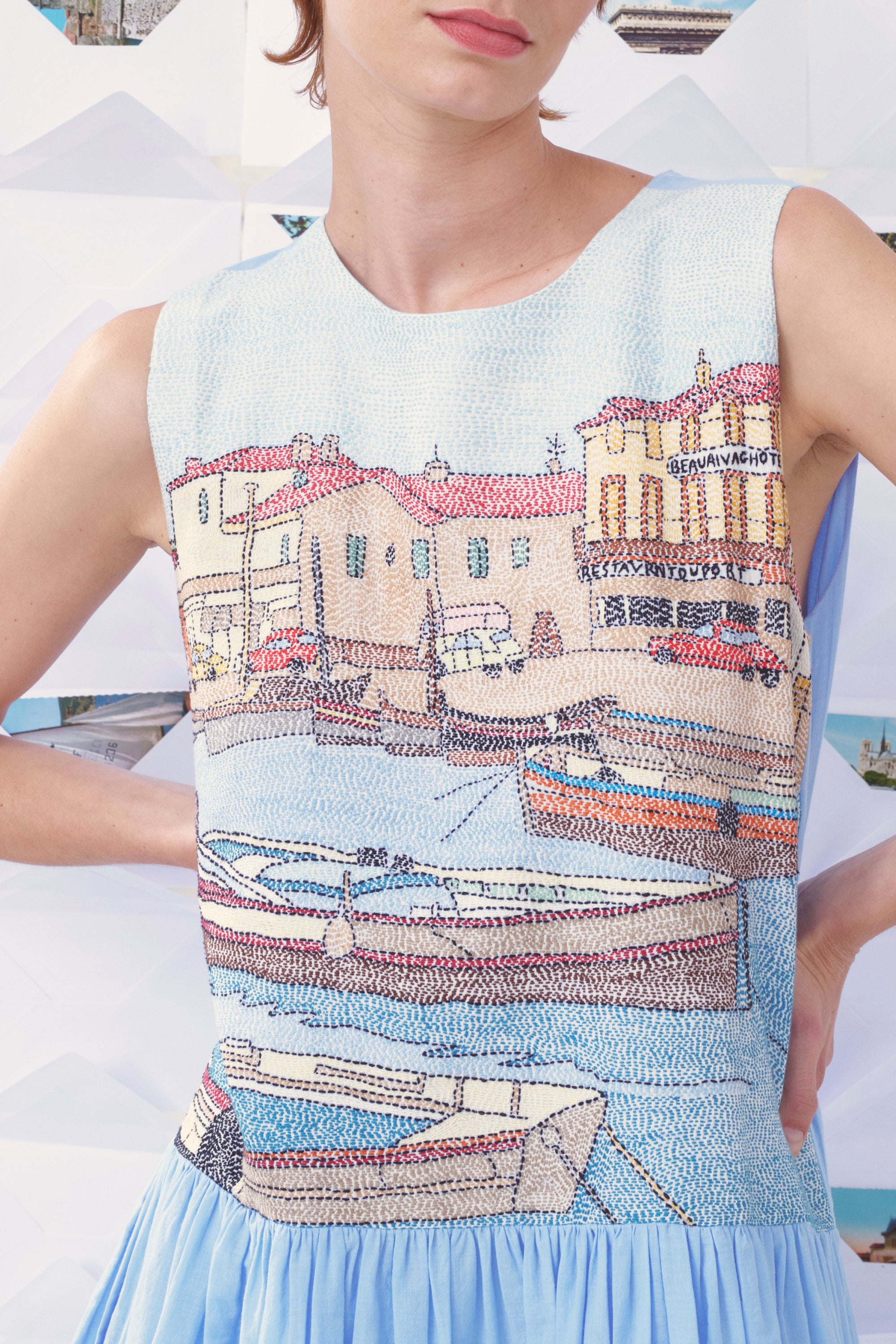 La robe edith est tissée à la main en voile de coton léger. Elle dévoile le paysage du port de Martigues dans le Sud de la France, brodé selon la technique traditionnelle Kantha.