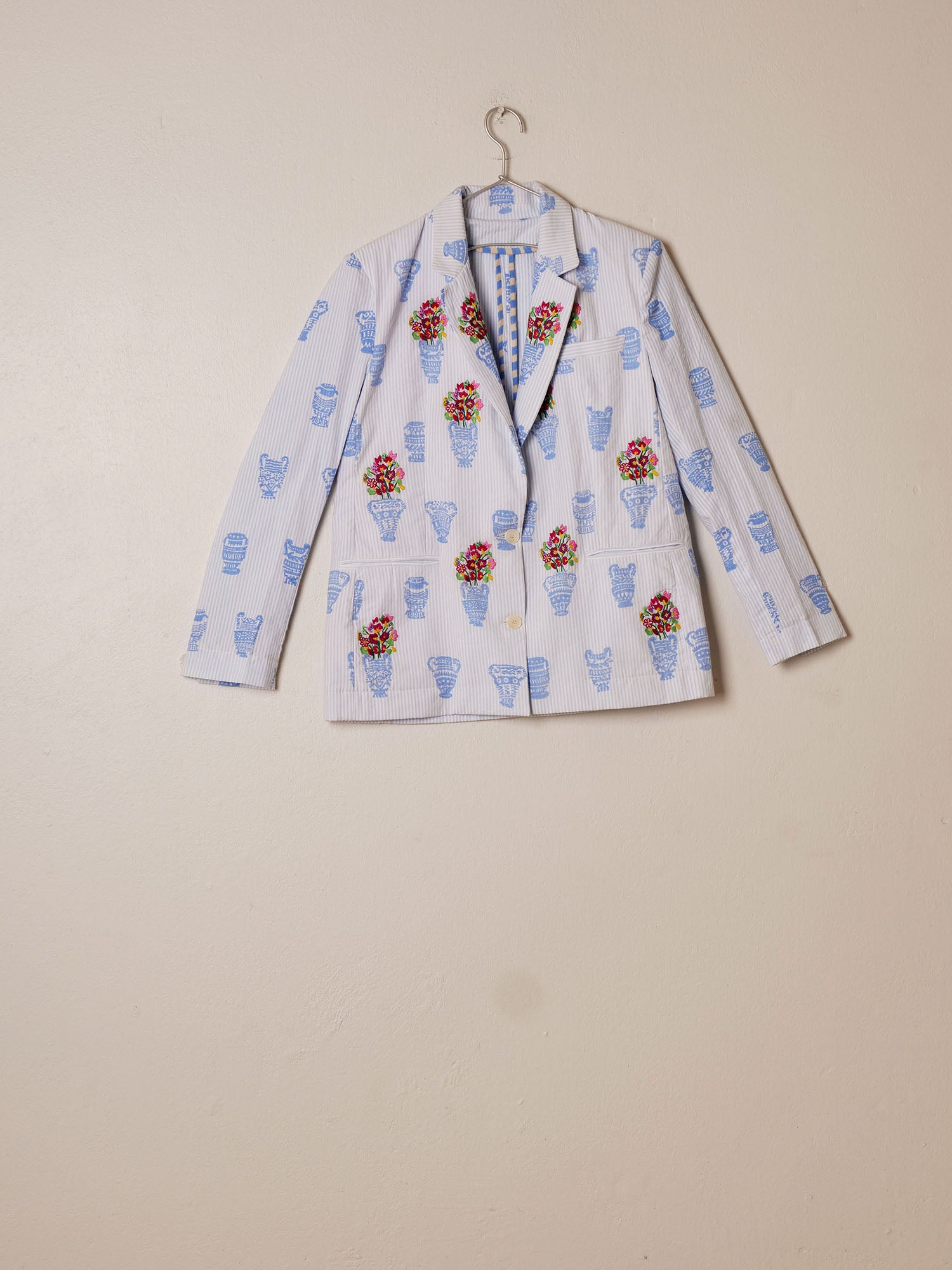 La veste titi, en seersucker de coton, met en scène des vases inspirés des Cyclades, imprimés en sérigraphie. Des bouquets de fleurs brodées à la main en rehaussent le motif, apportant relief et texture. Elle se marie parfaitement avec le pantalon kika du même motif.
