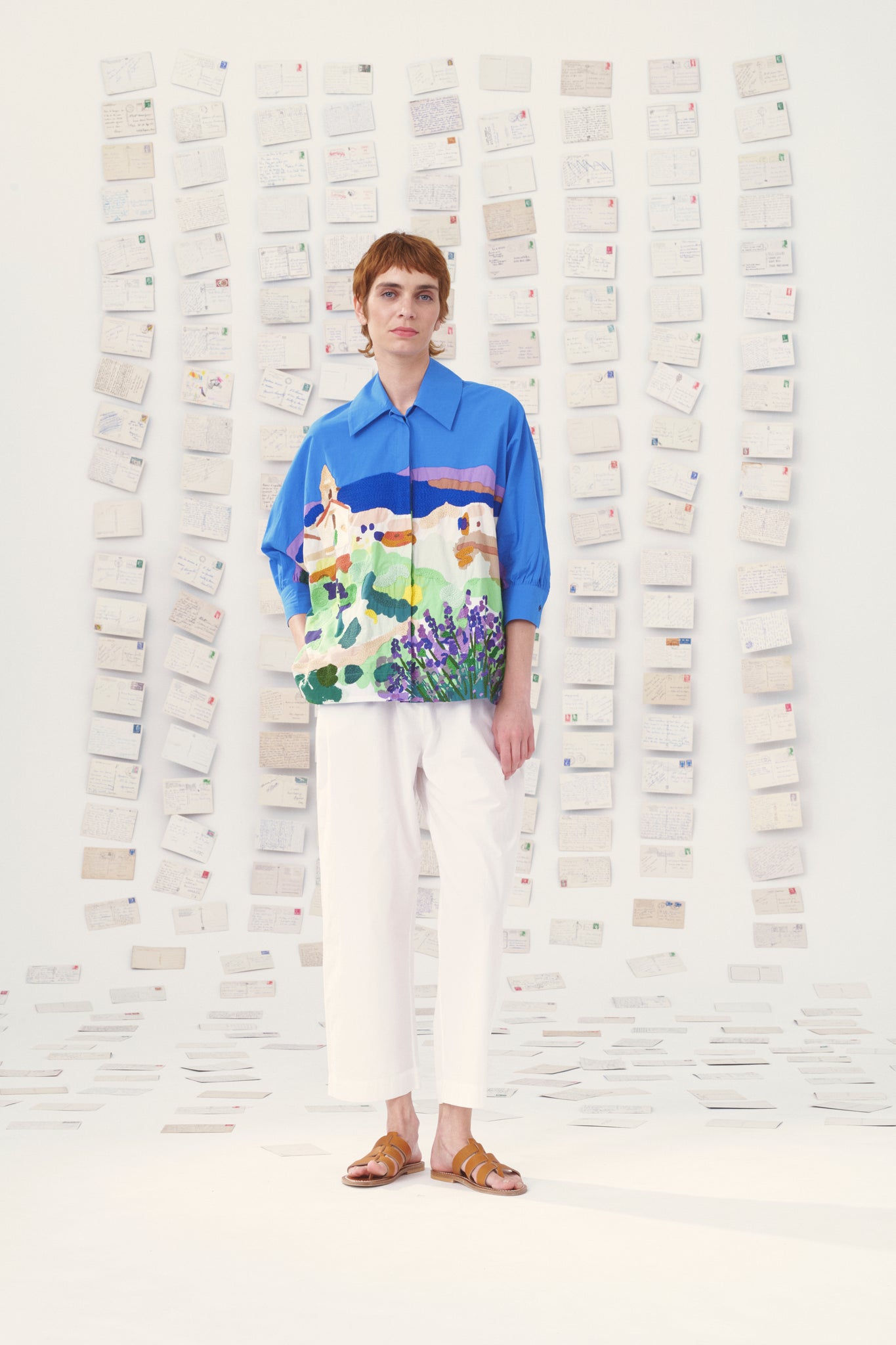 Le pantalon kika est en popeline de coton. Une pièce lumineuse qui se marie facilement avec une pièce forte, comme la chemise manuela et son paysage de Venasque.