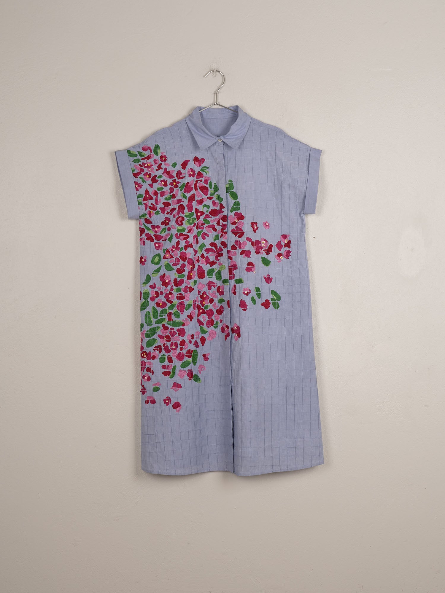 La robe elios, évoque une pergola recouverte de bougainvillier. Courte et graphique, en popeline de coton elle est entièrement repiquée d'un quadrillage réalisé en pintuck. Les fleurs de bougainvillier ont été brodées à la main en fil de coton.