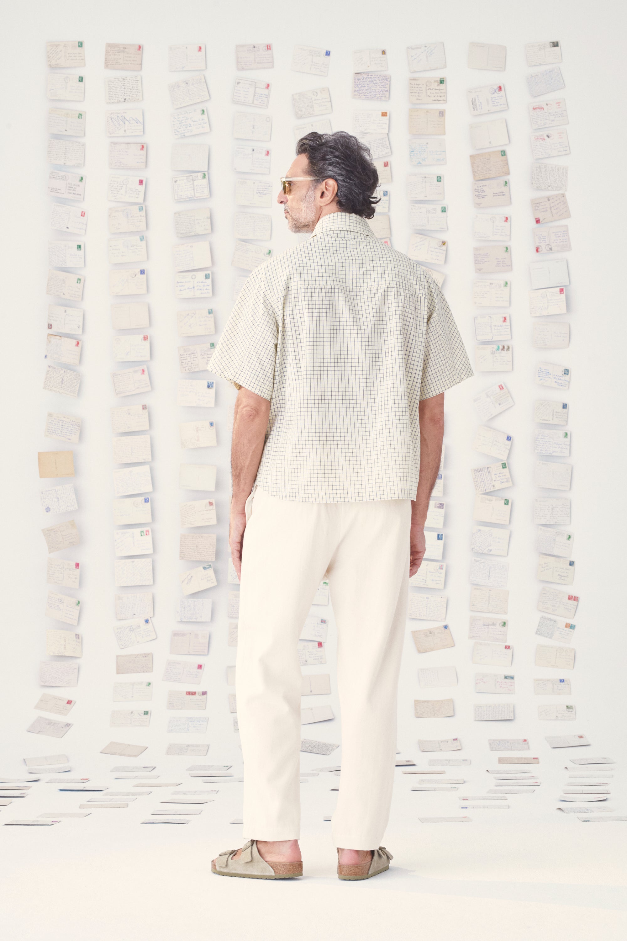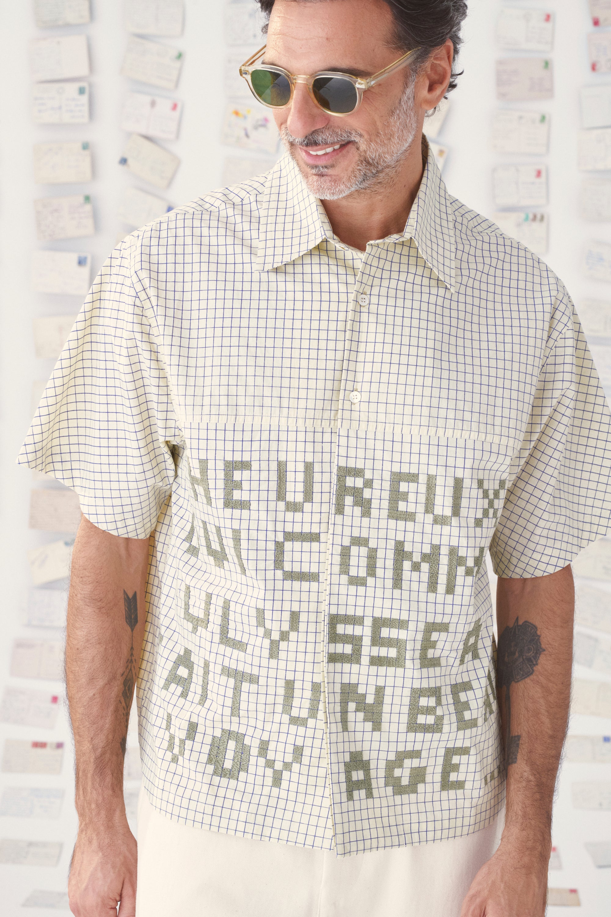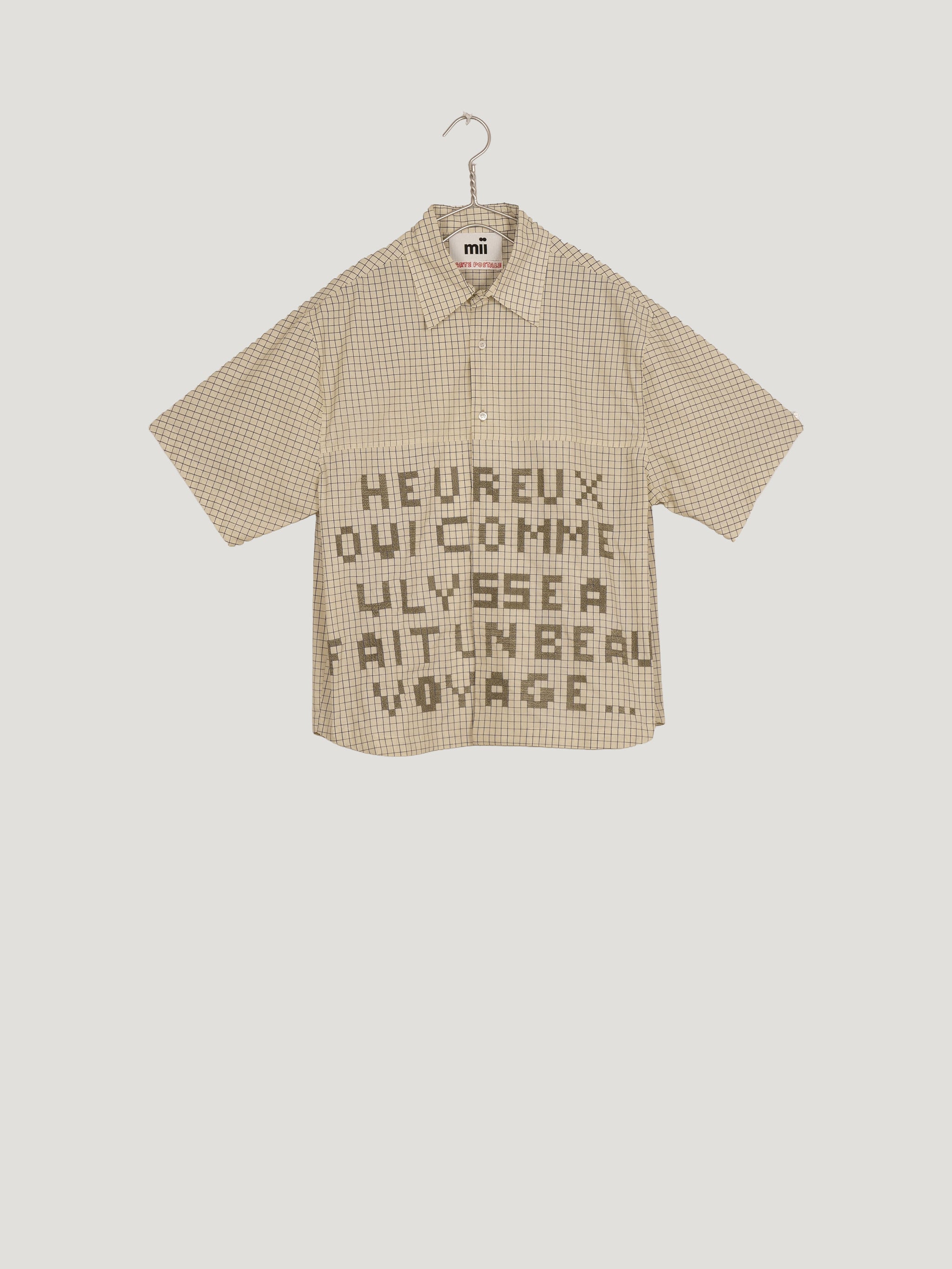 En popeline de coton, la chemise deba associe carreaux sérigraphiés et broderie délicate. La phrase « Heureux qui, comme Ulysse, a fait un beau voyage », brodée à la main au fil vert sauge, rend hommage au poème de Joachim du Bellay et évoque l’esprit des Cyclades.