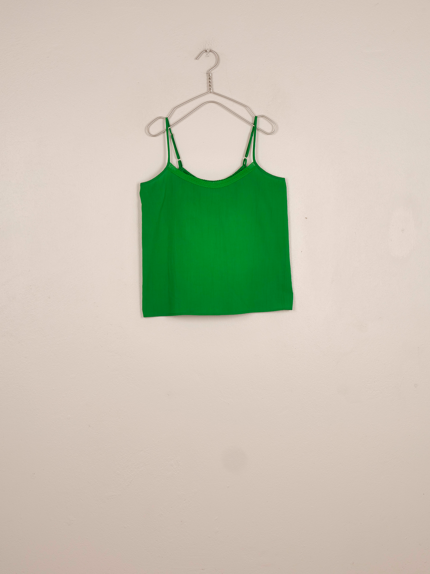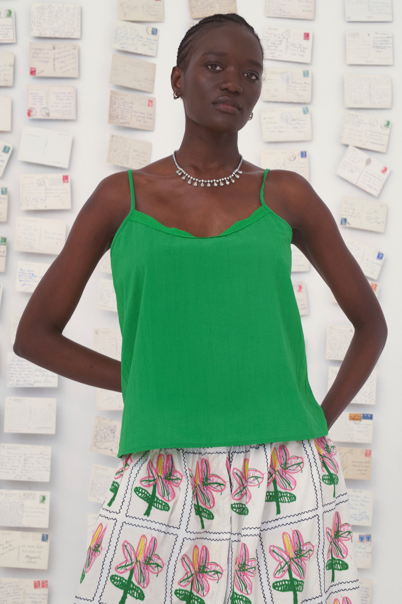 Entièrement tissé à la main en coton, le top dafni est rehaussé d’un délicat galon de dentelle à l'encolure. Il est disponible en trois teintes : vert, blanc cassé et bleu ciel.