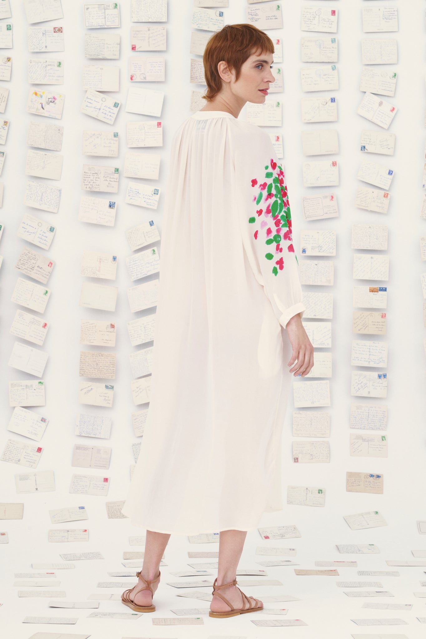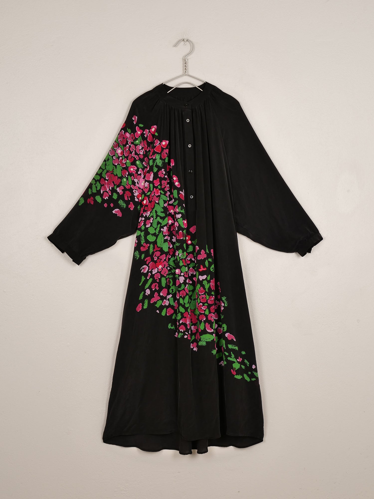 La robe itake, à manches longues, est confectionnée dans une soie délicate ornée de fleurs de bougainvilliers imprimées en sérigraphie. Certains détails, brodés à la main, apportent relief et délicatesse à la pièce.