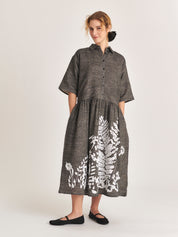The "Winter Landscape" theme evokes the snowy vegetation we find on the edges of woods, on the side of roads. Ferns, grasses, etc. were embroidered with an Aari needle and white thread on a beautiful mottled gray wool cloth. The Ambre dress has a shirt collar, is oversized, and has short sleeves. Made of gray mottled boiled wool, it is a warm dress for winter.
