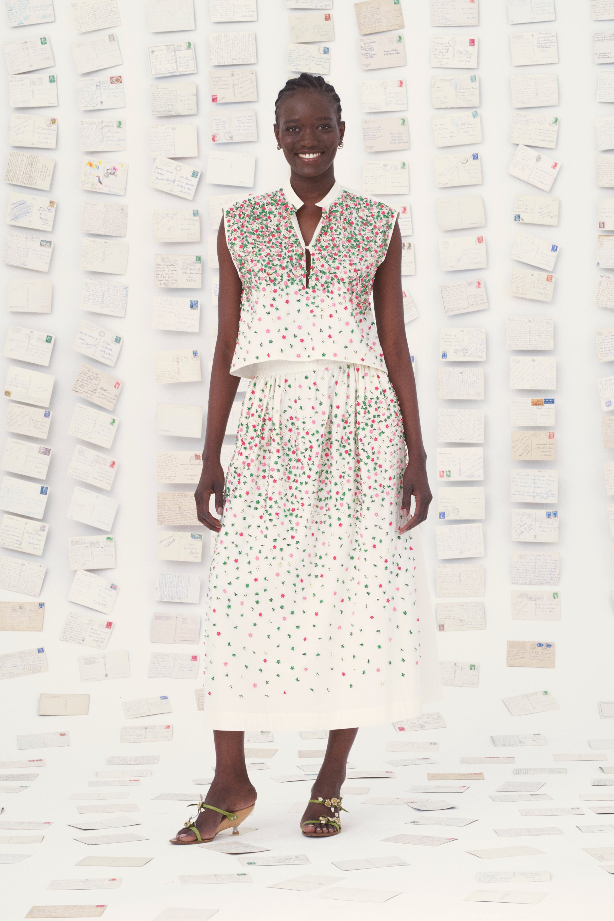 La jupe mantou est imaginée dans une démarche d’upcycling. De petites fleurs, découpées au laser dans les tissus dormants de nos précédentes collections, sont ensuite brodées à la main sur l’ensemble de la pièce, créant l’effet d’un champ de fleurs. Chaque fleur repose sur une fine tige composée de trois perles de verre.