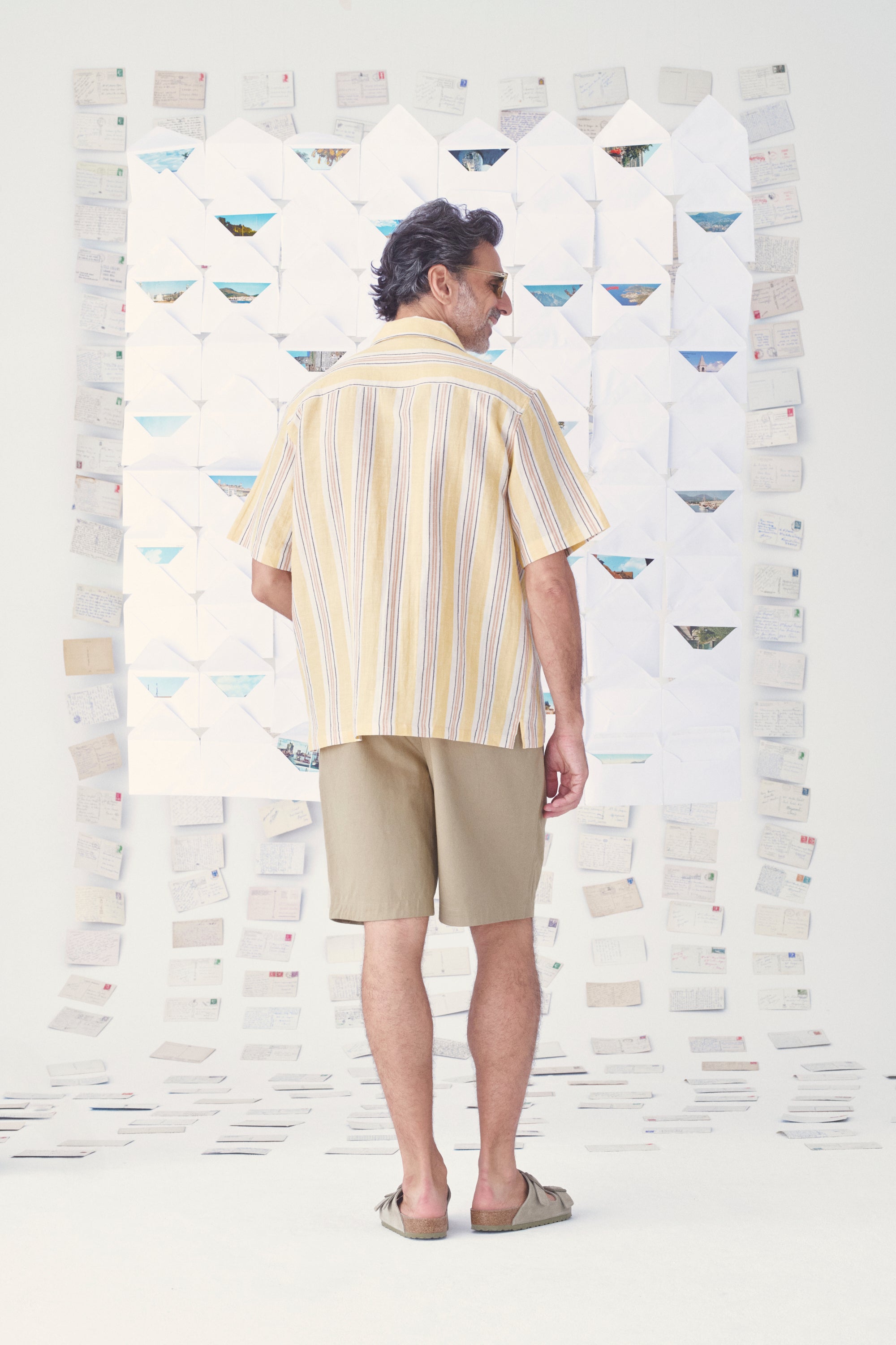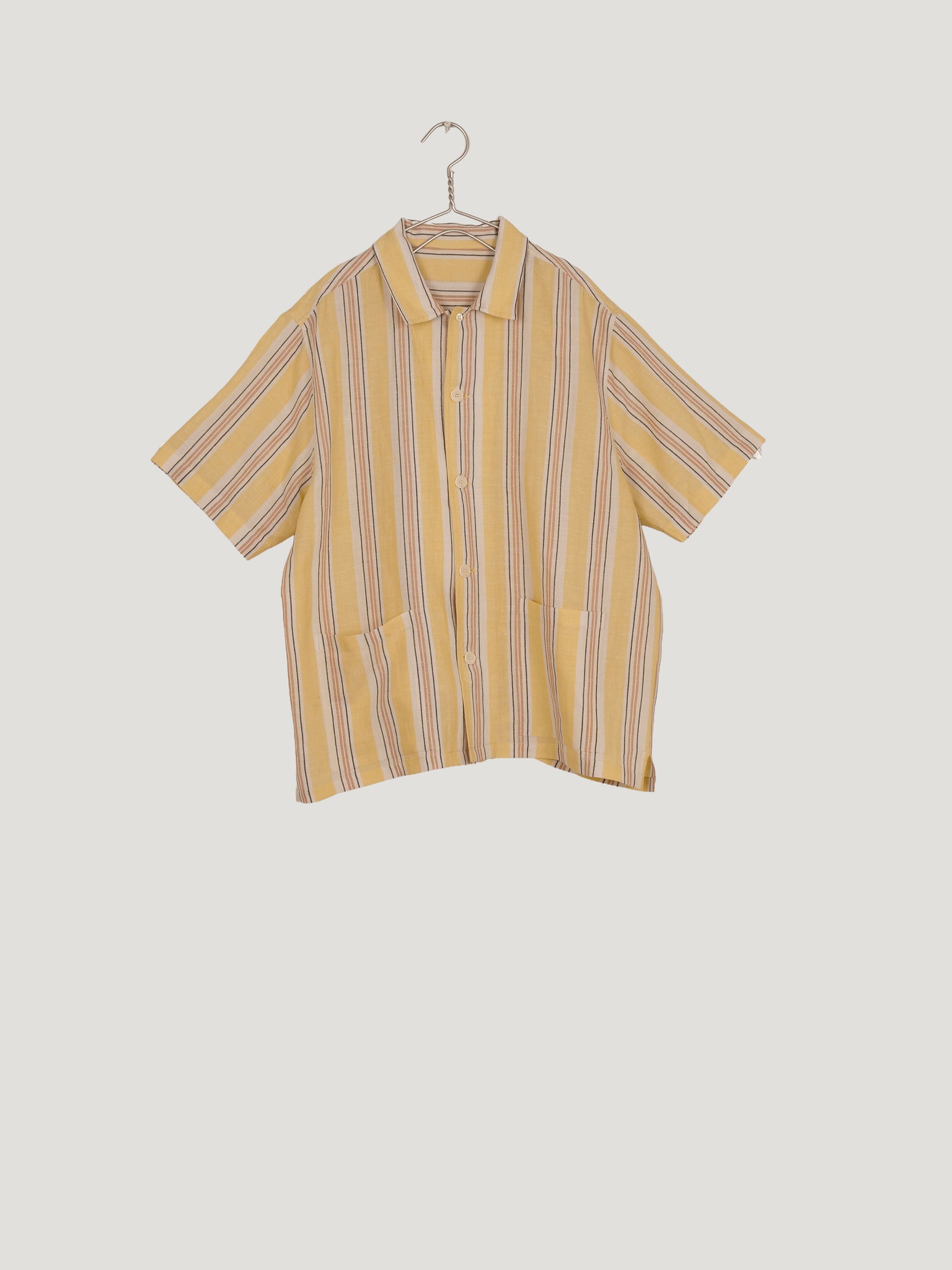 Confectionnée en lin et coton, la chemise shin se distingue par ses rayures inspirées des Cyclades, déclinées dans une teinte jaune beurre douce et solaire.
