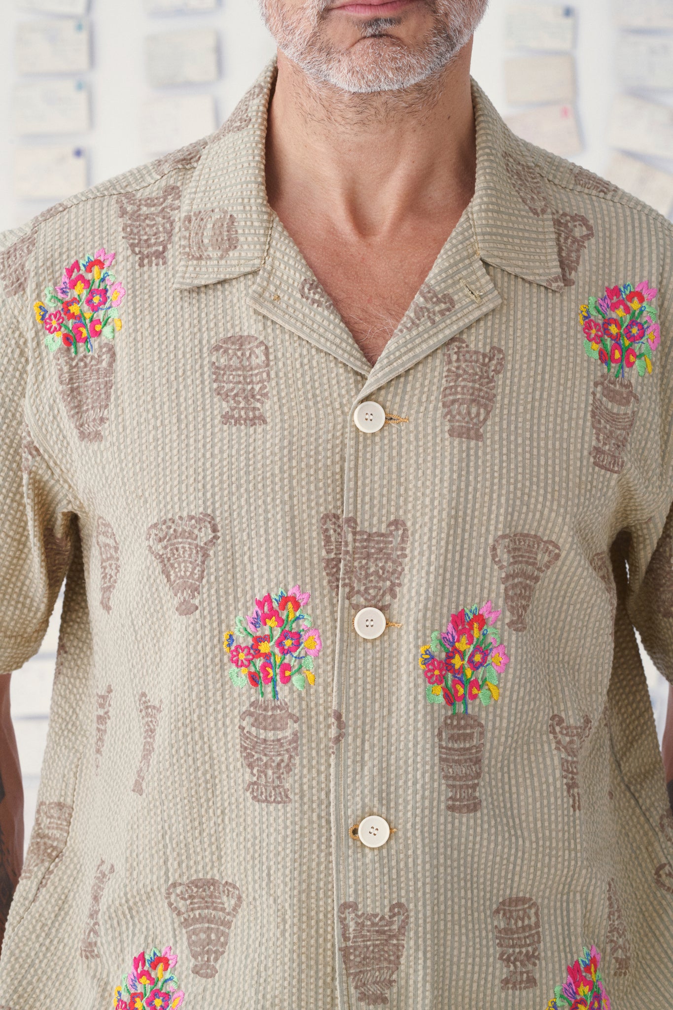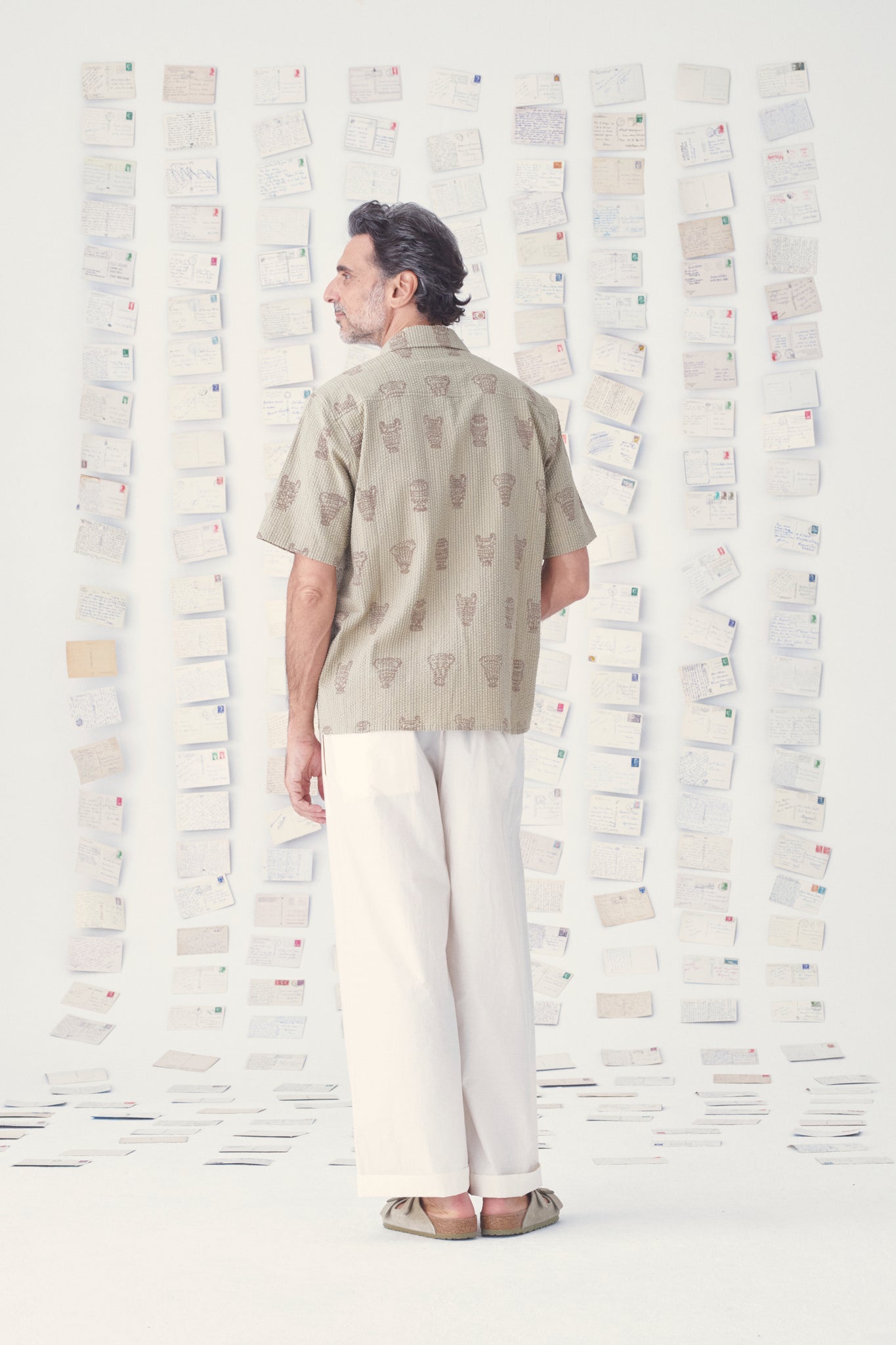 La chemise subha met en scène des vases inspirés des Cyclades, imprimés en sérigraphie puis brodés à la main.