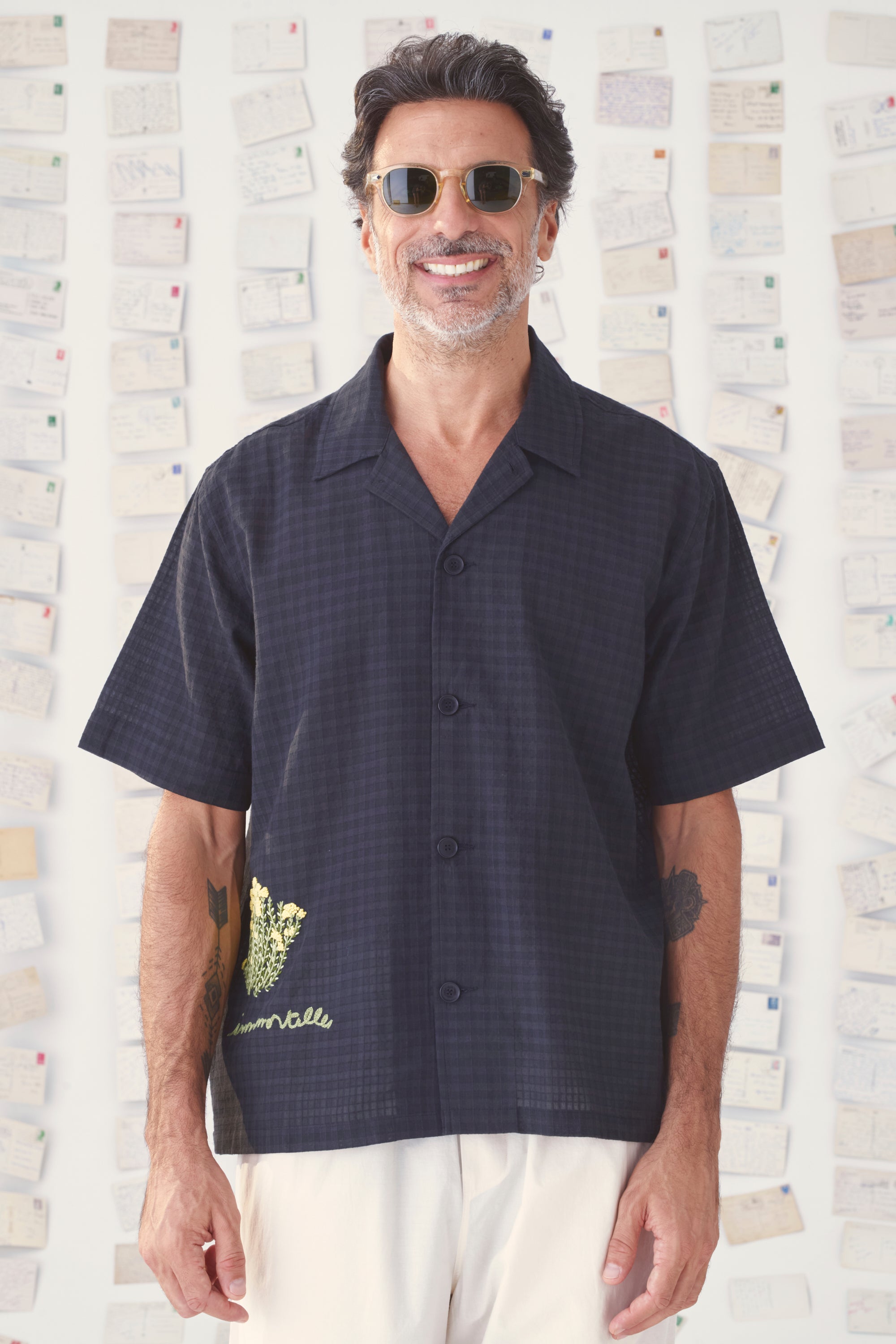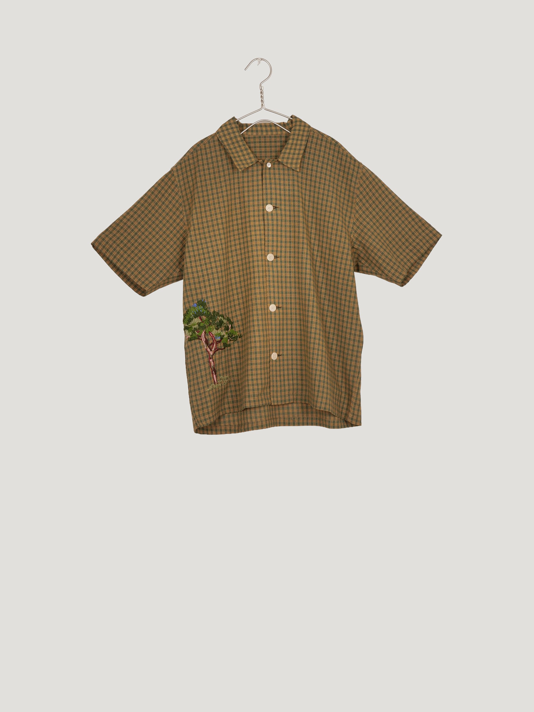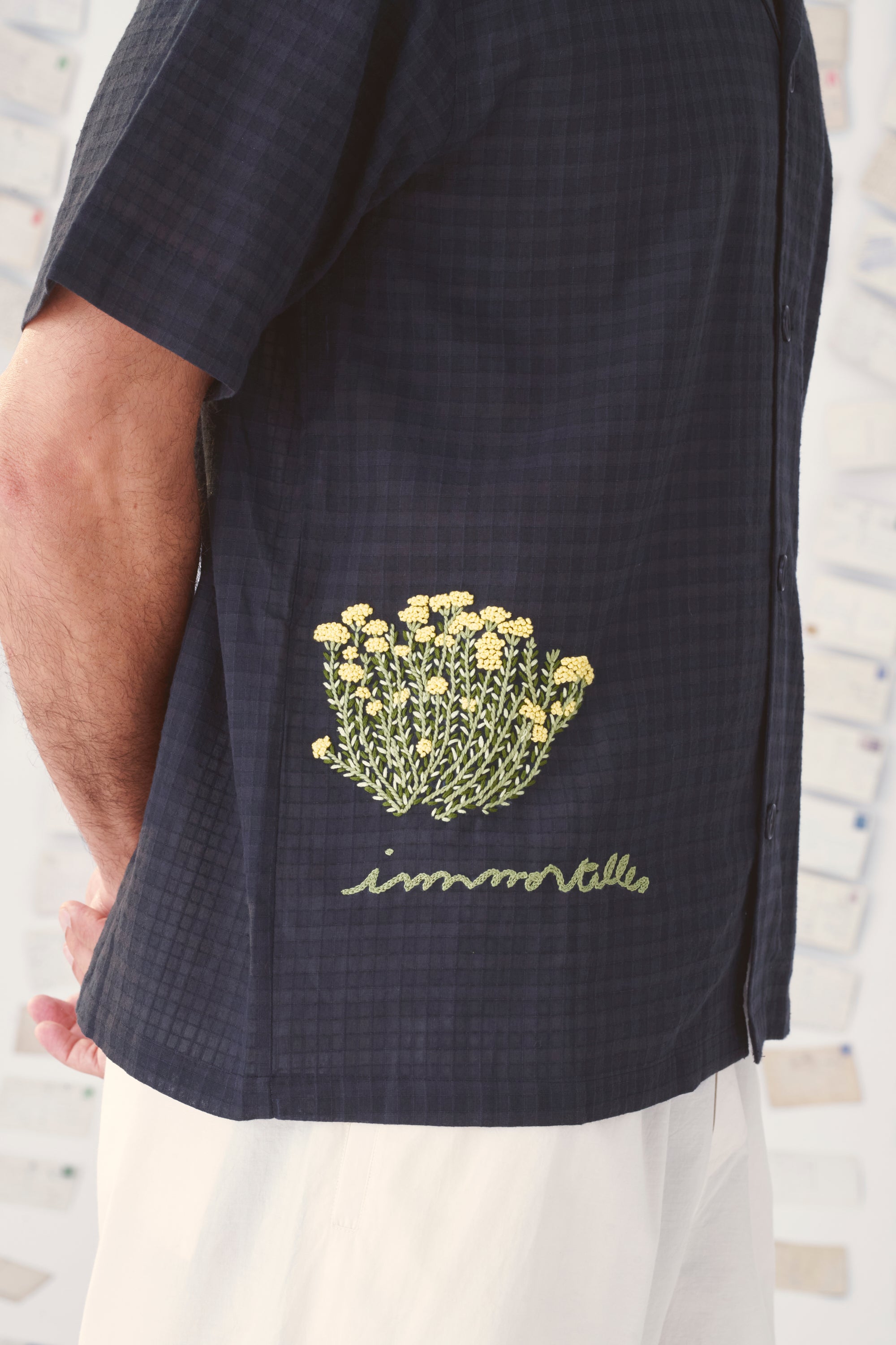 Confectionnée en coton chatai, la chemise shuba à manches courtes se décline en beige ou noir. Chaque teinte révèle un motif brodé à la main : fleurs d’immortelles ou pin maritime.