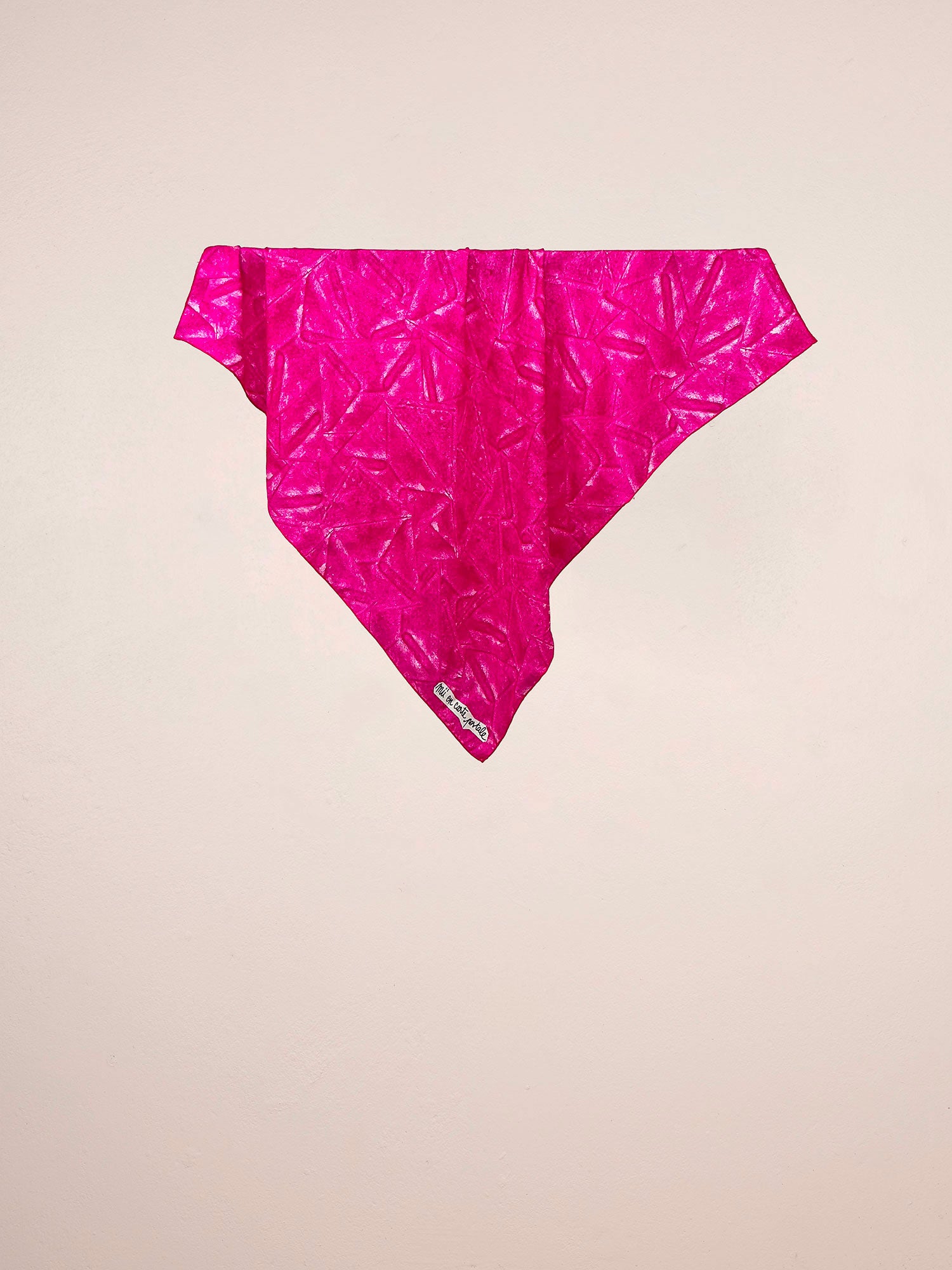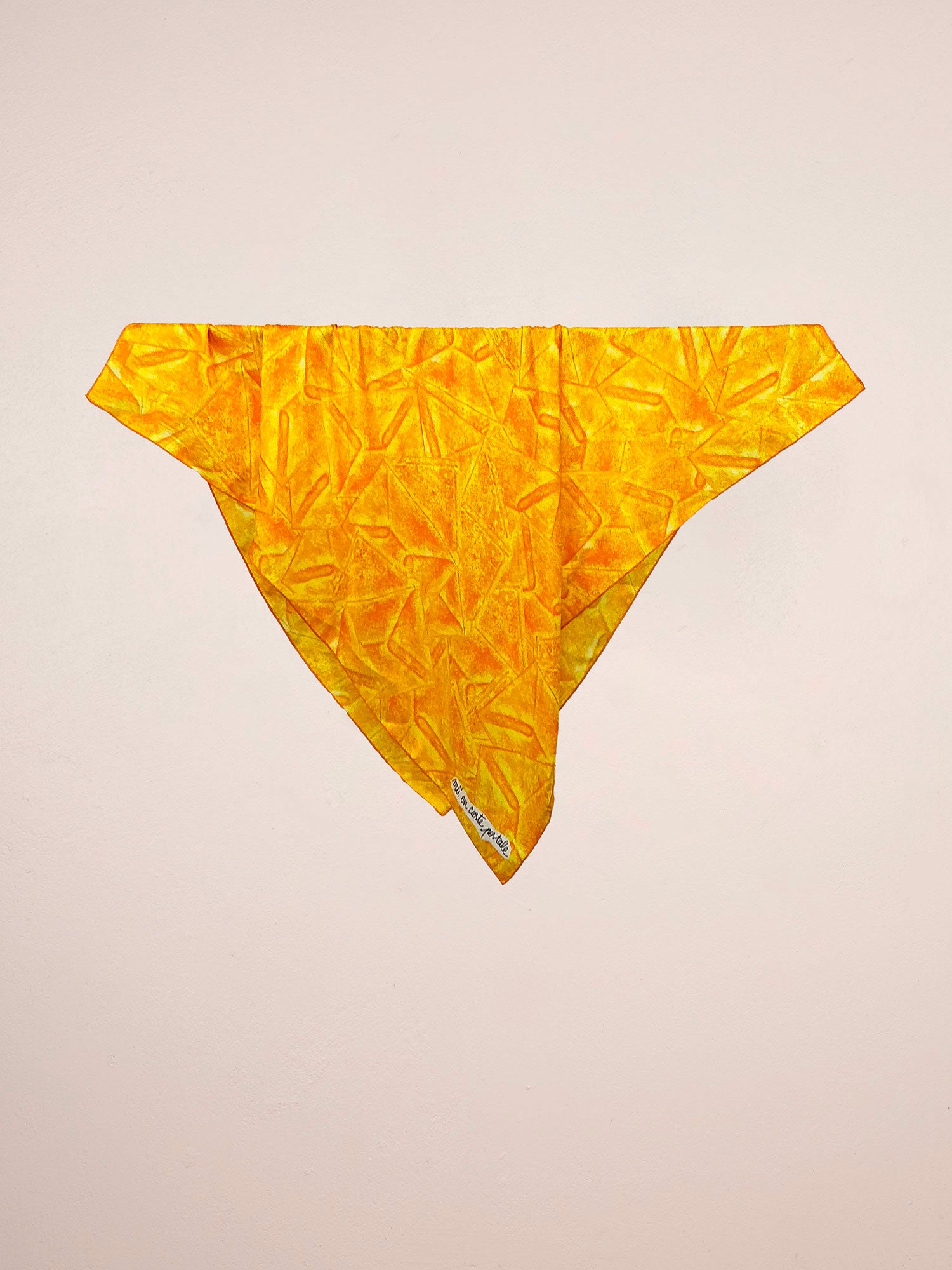En satin de soie lumineux, le carré enveloppes met en scène un ensemble de cartes postales sérigraphiées. Il se décline en deux teines : rose et jaune.