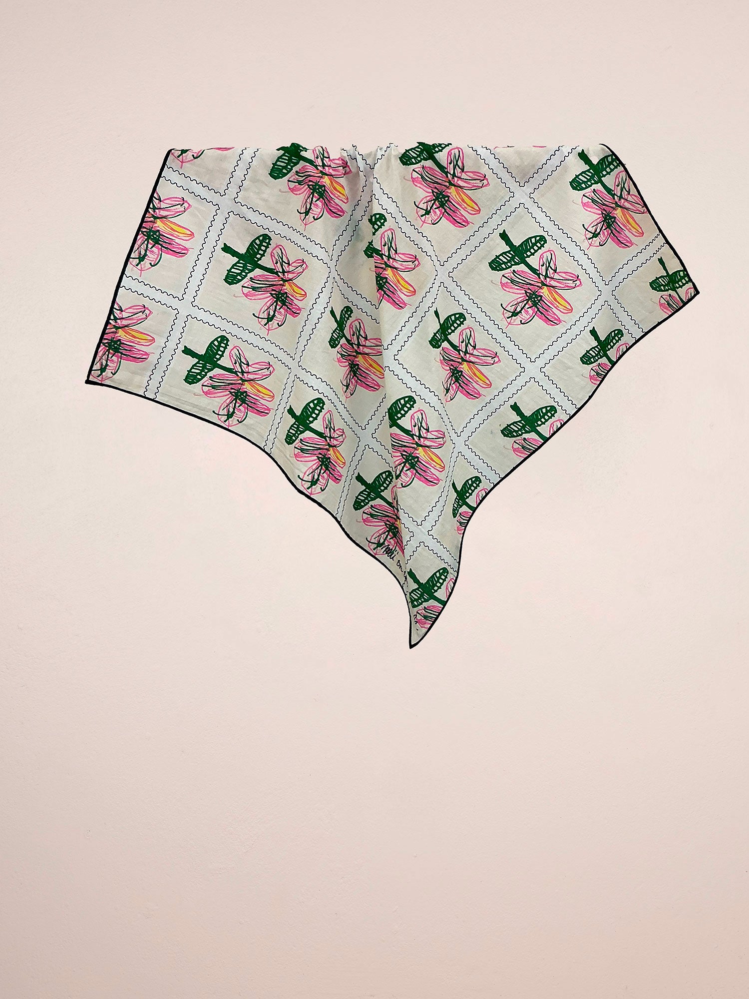 Le carré fleurs mina évoque une planche de timbres. Le motif est imprimé en sérigraphie puis brodé à la machine.