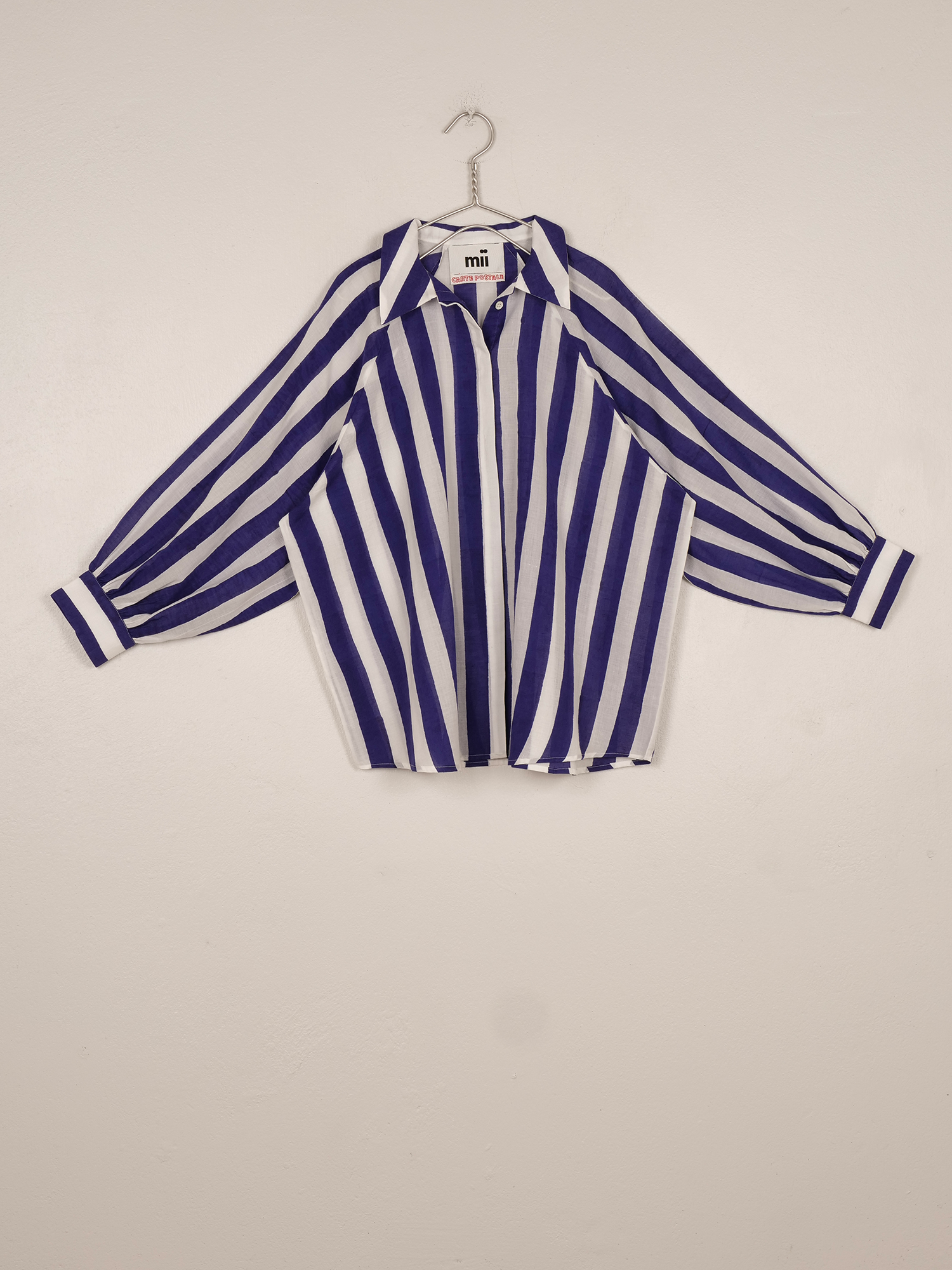 Confectionnée selon la technique artisanale du block print, la chemise lulu à manches longues s’inscrit dans le thème des Cyclades. Elle se décline en deux couleurs : cyan/abricot et blanc/bleu royal.