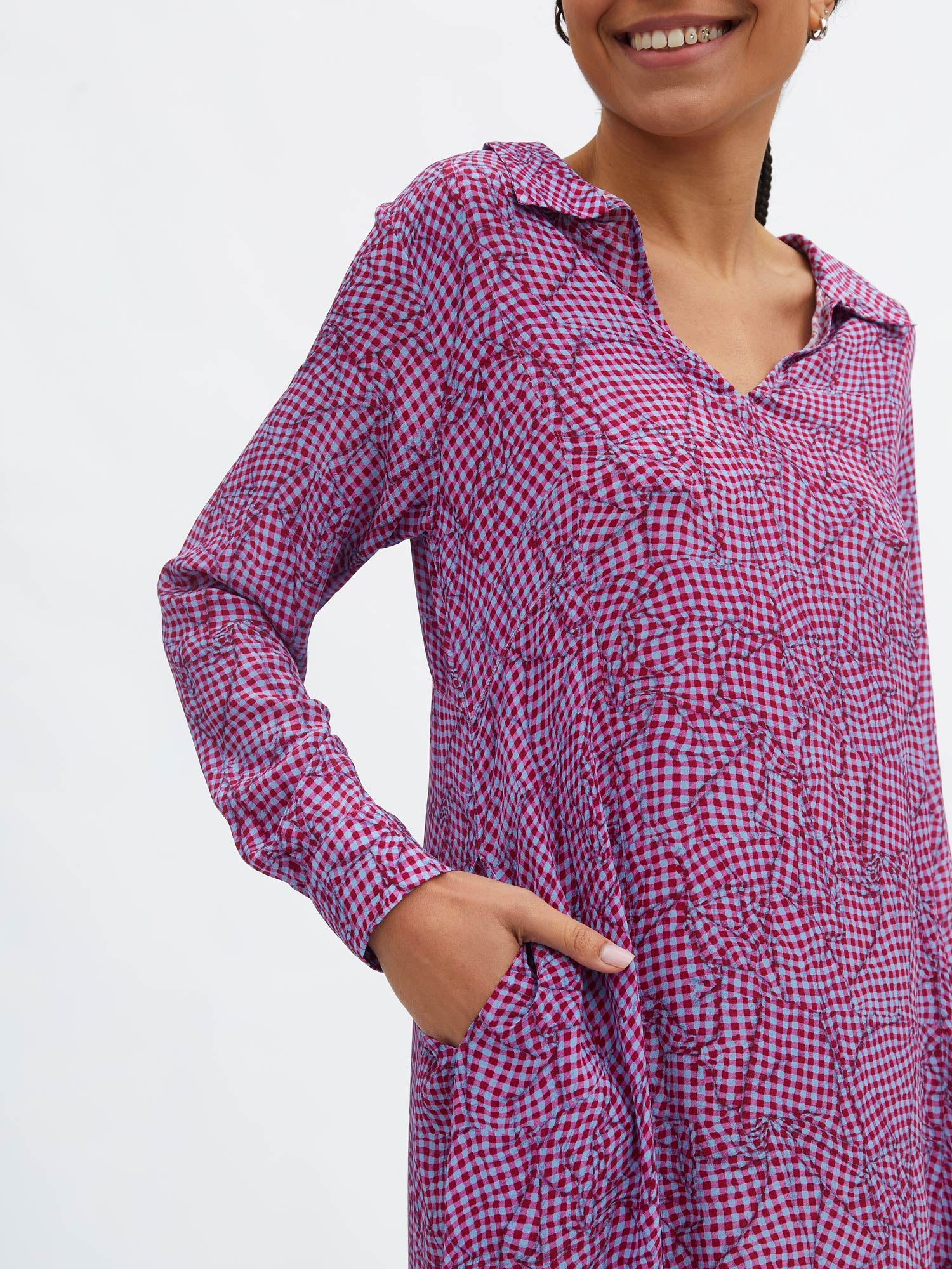La Djellaba Stella est une longue robe en soie. Cette pièce souple et fluide est détaillée d'un petit bouton au niveau du col. Sobre et élégant, son imprimé "faux froissé" petits carreaux est travaillé comme une étude d'un détail de carreau d'une estampe japonaise.