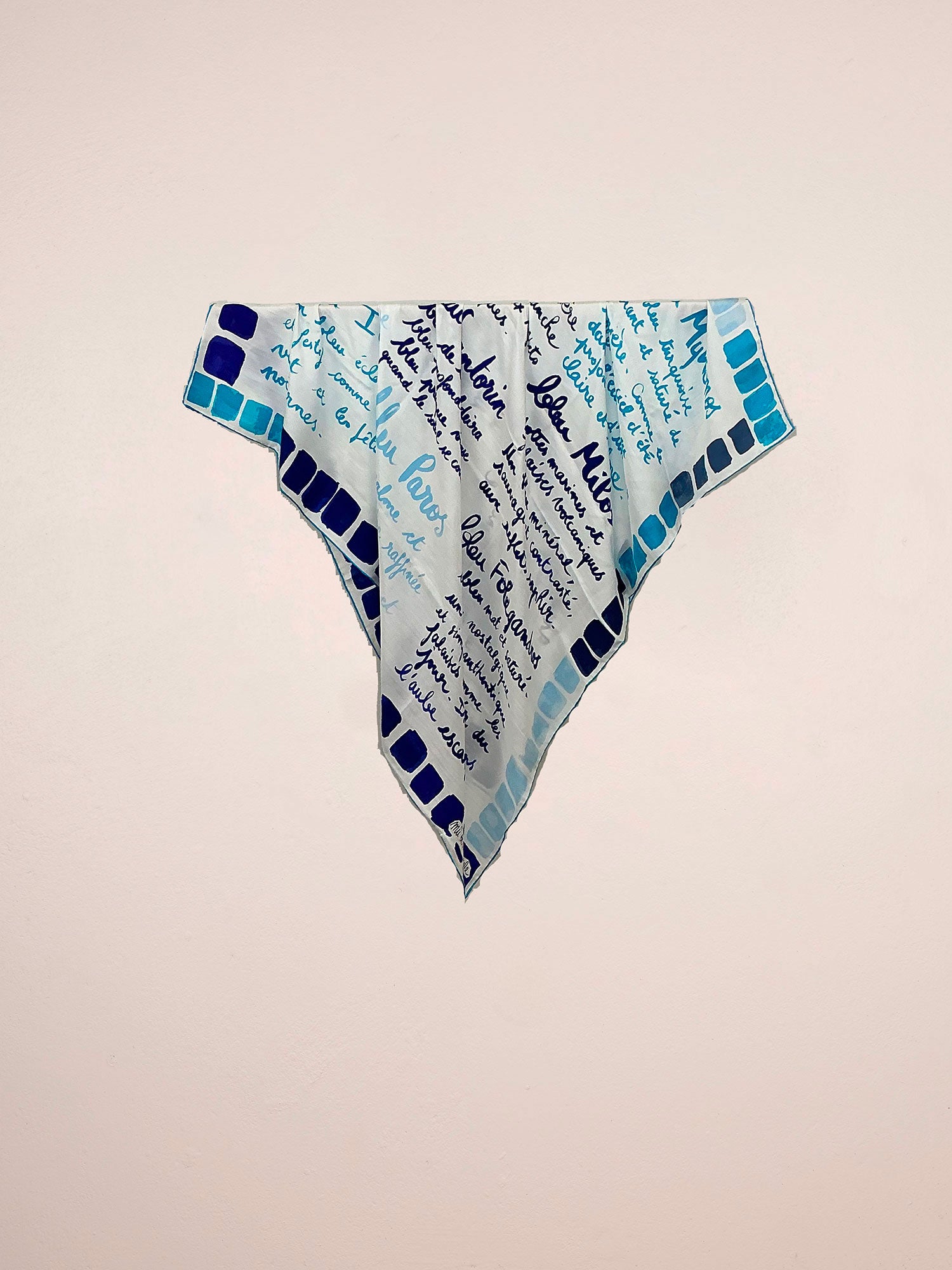 En soie, le grand carré nuancier s’inspire des Cyclades et explore toute la richesse des bleus méditerranéens.