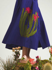 La jupe Mona Cactus est en popeline de coton, brodée à la main grâce à la technique Aari. Cette jupe longue d'un bleu majorelle profond, est boutonnée à la taille. Sa broderie d'une précision exceptionnelle représente un cactus en fleurs.