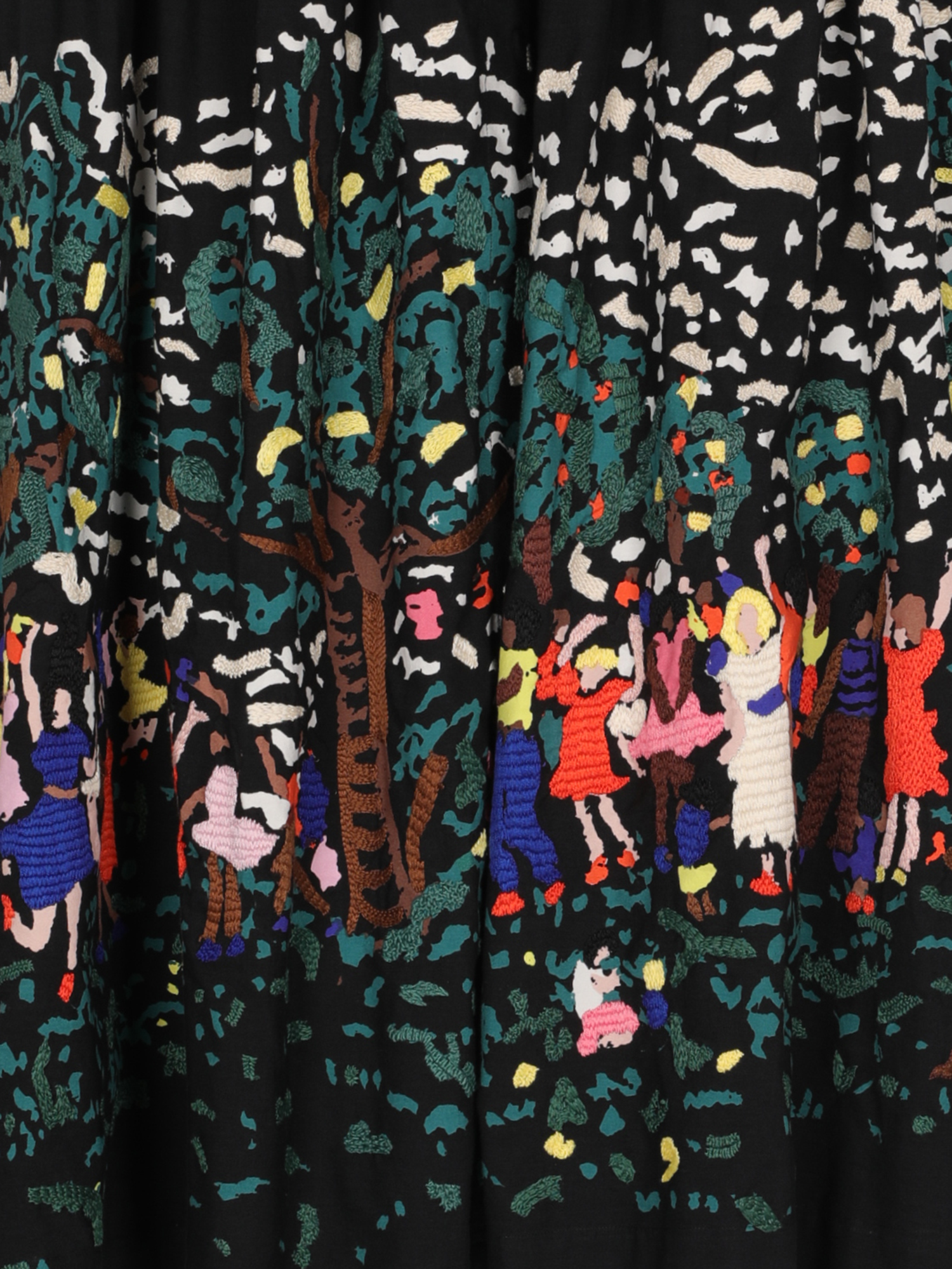 À l'ombre d'un platane, des couples dansent, rient et profitent de la douceur estivale. Brodé et imprimé à la main ce motif festif pare la robe Joe de nombreuses couleurs. En popeline de coton, cette robe portefeuille sans manches illustre parfaitement le thème global de notre collection "mii en fête".
