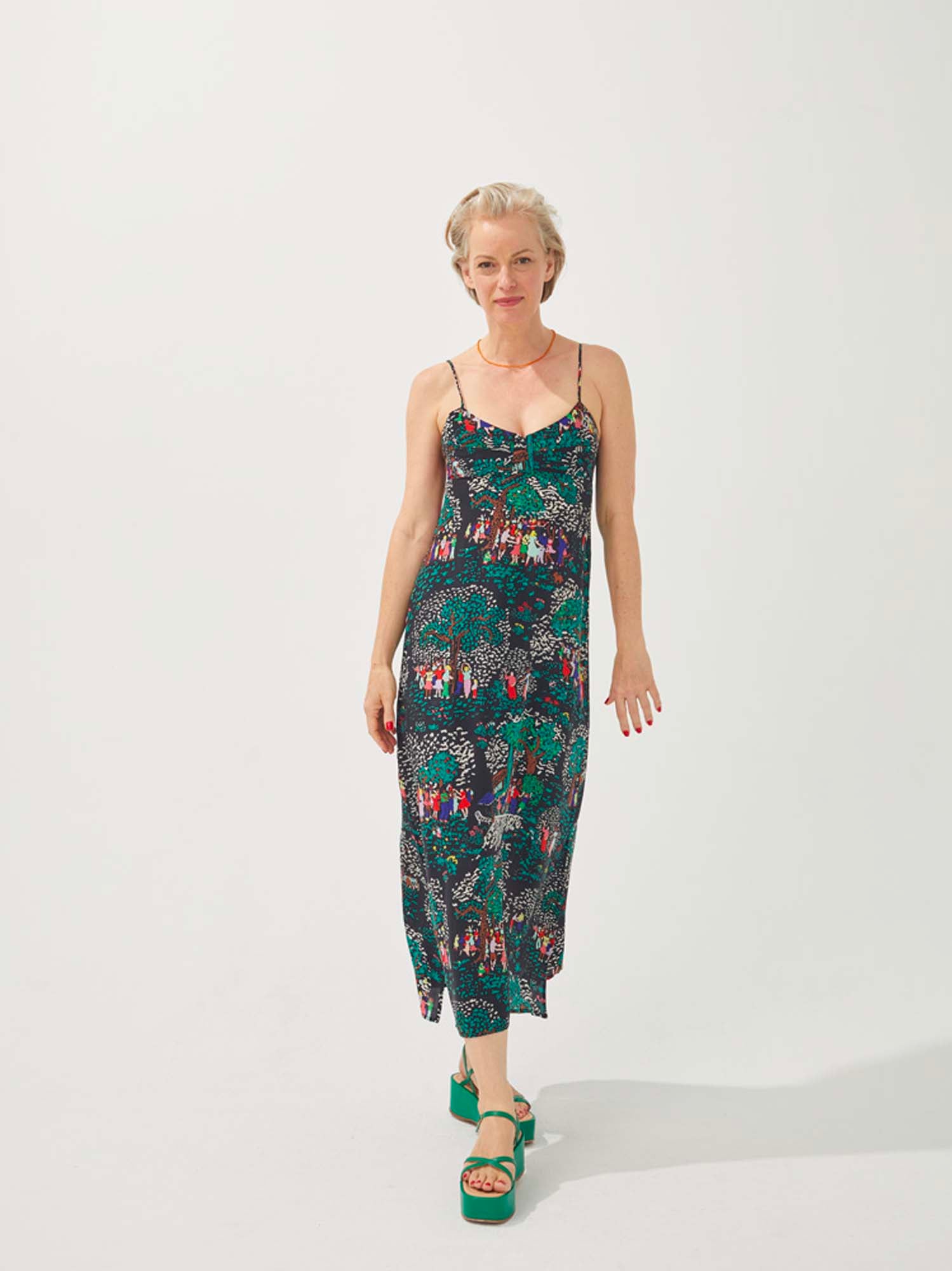 Dans l'idée des toiles de Jouy, l'imprimé de cette robe légère en soie met à l'honneur des petites scènes de fêtes de villages dans des couleurs vives et raffraîchissantes qui rappellent les douces soirées d'été. Elle est dotée d'un joli décolleté en forme de v et d'une fermeture zippée pour faciliter l'ajustement. Une belle occasion pour nous rappeler que la vie est une fête !