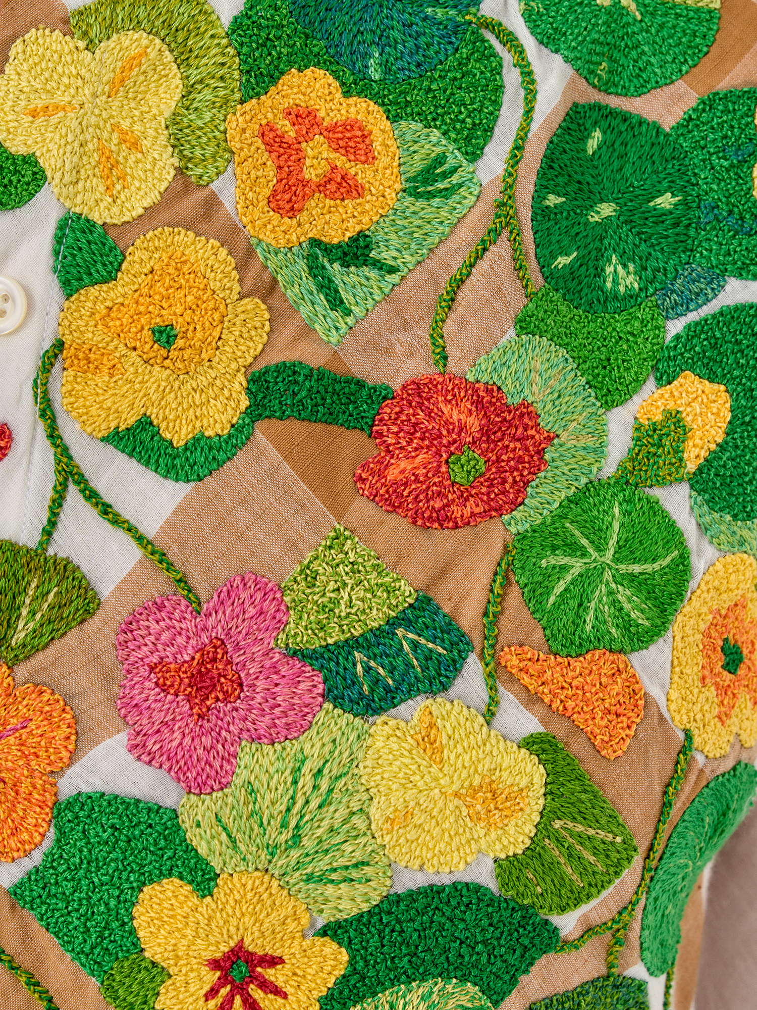 Cette pièce est l'association exceptionnelle de deux de nos savoir-faire, le tissage et la broderie. Le tissage reprend le motif graphique d'un treillis en bois. Les broderies deviennent des plantes grimpantes qui semblent s'entrelacer dans notre quadrillage. La glycine pour le printemps, la capucine pour l'été et la vigne pour l'automne. La tunique Lulu est une chemise longue très ample et légère. Disponible en taille unique pour satisfaire toutes les morphologies.